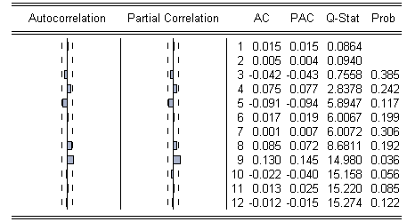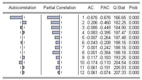 Четвёртое значение Q-Stat (10,508) уже превышает критическое (9,48773), что означает: среди первых четырёх коэффициентов автокорреляции ряда хотя бы один окажется отличным от нуля (при уровне значимости 0,05). Тем не менее, по ряду «прирост» построить модель, зависящую от прошлых значений ряда будет проблематично: ведь зависимости текущего значения от предшествующих первых трёх нет, а корреляция четвёртого, восьмого, девятого и десятого порядков может оказаться наведённой.
