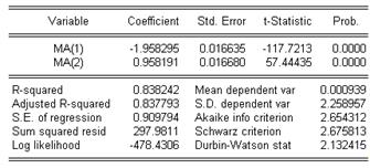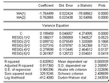 Эта модель характеризуется уже большими значениями критериев Акайке (2,435803) и Шварца (2,511055), по сравнению с MA(2)ARCH(5) (значения критериев Акайке и Шварца соответственно равны 2,322696 и 2,408699). Поэтому она менее предпочтительна: ведь критерии Акайке и Шварца совмещают оценивание качества модели по адекватности описания ею процесса и по количеству регрессоров, включённых в модель. Поскольку по сравнению с MA(2)ARCH(5) количество регрессоров сократилось, данная модель более плохого качества, чем MA(2)ARCH(5). Таким образом, среди моделей MA(2)ARCH наилучшей оказалась MA(2)ARCH(5), и она будет рассматриваться в курсовой работе.