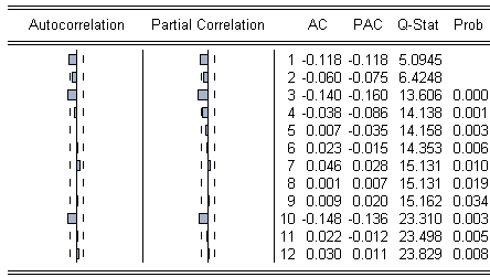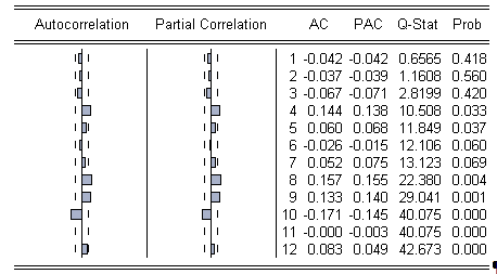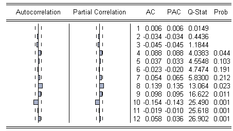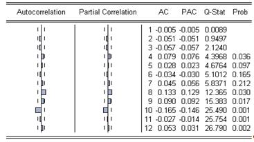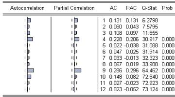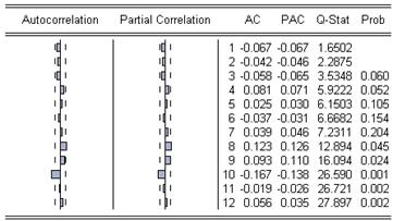 Первые три значения коэффициента корреляции и частной корреляции находятся в пределах доверительной трубки, а соответствующие им значения Q-Stat (0,6565; 1,1608; 2,8199) меньше критических (3,84146; 5,99146; 7,81473 соответственно), то есть первые три коэффициента автокорреляции ряда статистически равны 0.