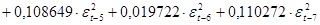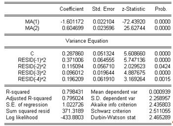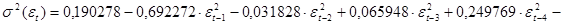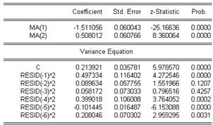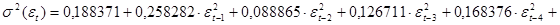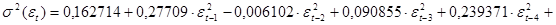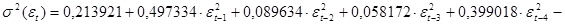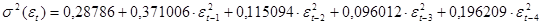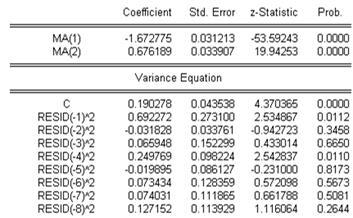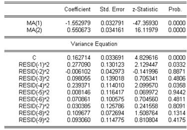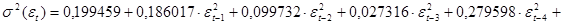 Все коэффициенты в модели дисперсии положительны, значения критериев Акайке и Шварца меньше, чем для модели МА(2). Тем не менее, вероятность статистической незначимости коэффициента при