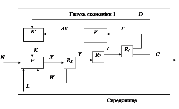 Розглянемо модель галузі економіки, що є декомпозицією загальної вербальної моделі. Нехай галузь випускає продукцію тільки одного виду. На рис. 4.1. показана схема галузі економіки. Схема включає підсистему виробництва продукції F , блоки розподілення RX , RY , R I , блок основних виробничих фондів К' та блок V приросту капіталу.