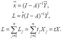 Введем понятие полных затрат труда как суммы прямых затрат живого труда и затрат овеществленного труда, перенесенных на продукт через израсходованные средства производства. Если обозначить величину полных затрат труда на единицу продукции j-го вида через Tj , то произведения вида aij Ti отражают затраты овеществленного труда, перенесенного на единицу j-го продукта через i-e средство производства; при этом предполагается, что коэффициенты прямых материальных затрат аij выражены в натуральных единицах. Тогда полные трудовые затраты на единицу j-го вида продукции (коэффициент полной трудоемкости) будут равны