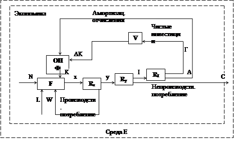 В блоке распределения Px разделяется на W и конечный продукт Y. В блоке распределения Py разделяется на непроизводственное потребление C и инвестиции I. Инвестиции разделяются на амортизационные отчисления A и чистые инвестиции I1.