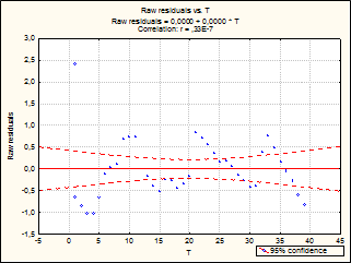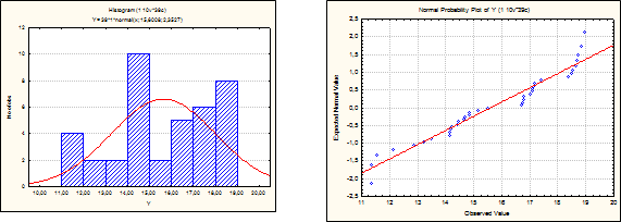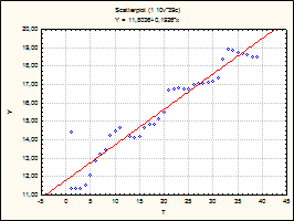 | Regression Summary for Dependent Variable: Y R= ,96060625 RI= ,9226437 Adjusted RI= ,92067692 F(1,37)=442,05 p<0,0000 Std.Error of estimate: ,66263 |
