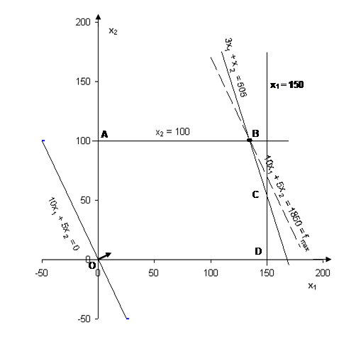 Проведем прямую 3x1 + x2 = 505 через точки (110; 175) и (175; -5). Подставим в первое неравенство координаты точки (0; 0): 3×0 +1×0 = 0 < 505, так как неравенство выполняется, то выбираем полуплоскость, содержащую эту точку.