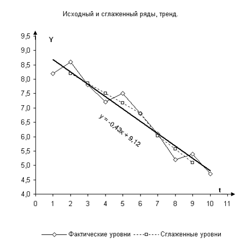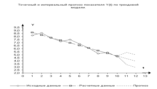 Точечный прогноз для Y получим, подставляя в трендовую модель t =11 и t = 12.