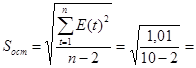 RSт = 2,7 - 3,7; так как расчетное значение RS - критерия RSрасч = 2,87 попадает внутрь интервала от 2,7 до 3,7, то остатки E(t) подчиняются по нормальному закону распределения.