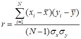 7. Корреляция Пирсона. Наиболее часто используемый коэффициент корреляции Пирсона r называется также линейной корреляцией, т.к. измеряет степень линейных связей между переменными. Можно сказать, что корреляция определяет степень, с которой значения двух переменных пропорциональны друг другу. Важно, что значение коэффициента корреляции не зависит от масштаба измерения. Например, корреляция между ростом и весом будет одной и той же, независимо от того, проводились измерения в дюймах и фунтах или в сантиметрах и килограммах. Пропорциональность означает просто линейную зависимость. Корреляция высокая, если на графике зависимость можно представить прямой линией (с положительным или отрицательным углом наклона). Проведенная прямая называется прямой регрессии или прямой, построенной методом наименьших квадратов. Последний термин связан с тем, что сумма квадратов расстояний (вычисленная по оси Y) от наблюдаемых точек до прямой является минимальной из всех возможных. Заметим, что использование квадратов расстояний приводит к тому, что на оценки параметров сильно влияют выбросы. Корреляция Пирсона предполагает, что две рассматриваемые переменные измерены, по крайней мере, в интервальной шкале. Коэффициент корреляции Пирсона вычисляется следующим образом: