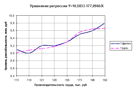 Ответ: Таким образом, произведенный анализ показывает, что величина рентабельности предприятия очень сильно связана с производительностью труда (коэффициент корреляции равен 0,9566) гиперболической зависимостью. Уравнение регрессии имеет вид: