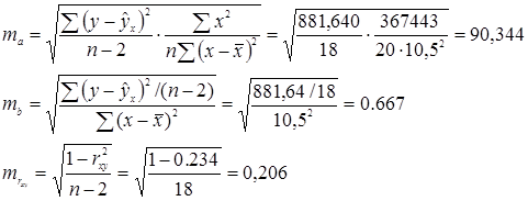 Полученные значения t-критерия показывают, что параметры a и b статистически незначимы, т.к. их фактические значения t-критерия меньше табличного. А коэффициент парной корреляции статистически значим, т.к. фактическое значение его t-критерия больше табличного.