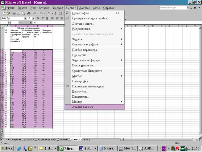 3) выбрать пункт меню «Сервис» и в появившемся меню выбрать «Анализ данных» (рис. 7);