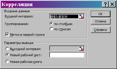 5) в появившемся диалоговом окне «Корреляция» (рис. 9) убедиться, что все проставленные в нем установки соответствуют таблице исходных данных. После выполнения этих операций нажать клавишу «ОК»;