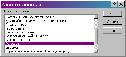 4) в появившемся диалоговом окне «Анализ данных» (рис. 11) выбрать «Регрессия»;