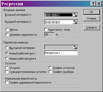 5) в появившемся диалоговом окне «Регрессия» (рис. 12) убедиться, что все проставленные в нем установки соответствуют таблице исходных данных. После выполнения этих операций нажать клавишу «ОК»;