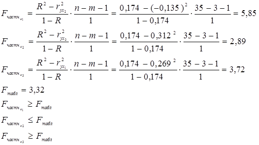Частные F-критерии оценивают статистическую значимость присутствия факторов в уравнении регрессии, оценивают целесообразность включения в уравнение одного фактора после другого.