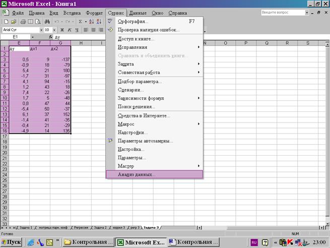 3) выбрать пункт меню «Сервис» и в появившемся меню выбрать «Анализ данных» (рис. 10);