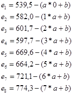 669,6 – (a*4 + b) + 664,2 – (a*5+ b) + 721,1 – (a*6 +b) + 774,3 – (a*7 +b)= 0,