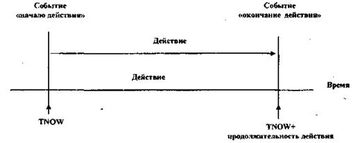 Понятие события, происходящего мгновенно в определенный момент времени, в который начинается или заканчивается некоторое действие, является основополагающим. На рис. 1.1 показана связь между понятиями «действие» и «событие». Внутри события время не изменяется, а изменения состояния системы происходят только в моменты наступления событий. Поведение системы имитируется последовательностью изменений ее состояния, происходящих по мере наступления событий.