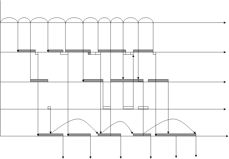 На данном рисунке изображена временная диаграмма, иллюстрирующая работу конвейерной системы. В данной системе имеется три обслуживающих устройства, которые обслуживаются двумя лентами конвейера. Изделия поступают на первый конвейер с постоянным интервалом, равным 10 единицам времени.