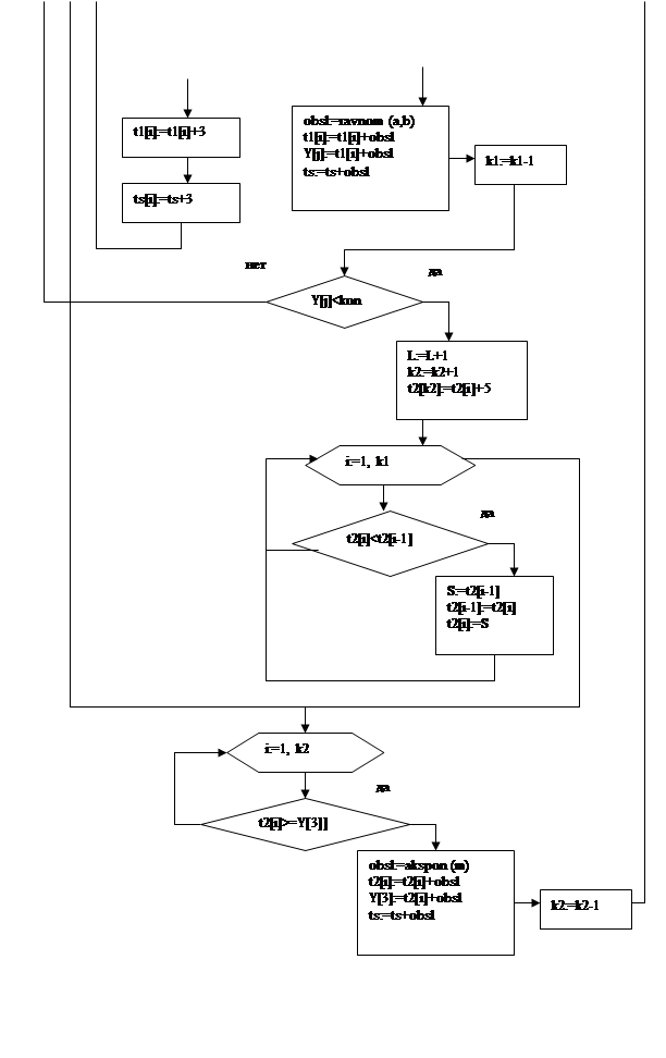 Два обслуживающих устройства установлено у ленты конвейера и, если они свободны, могут снимать изделия с конвейера. Изделия поступают на первый конвейер с постоянным интервалом, равным 10 единицам времени. Изделию, попавшему на конвейер, требуется 3 единицы времени, чтобы достичь первого обслуживающего устройства. Если первое устройство занято, изделие продолжает двигаться по ленте конвейера и через 3 единицы времени достигает второго обслуживающего устройства. Если оба устройства заняты, то изделие возвращается к устройствам через 9 единиц времени (если оно не будет снято другим устройством). Время обслуживания изделия распределено нормально с математическим ожиданием 5,0 и среднеквадратичным отклонением 1. Когда устройство у первой ленты завершает обработку изделия, оно помещает его на ленту второго конвейера, обслуживаемого другим устройством. Изделия поступают к третьему устройству через 5 единиц времени после попадания на второй конвейер. Если третье обслуживающее устройство занято, то изделие остается на ленте конвейера и через 12 единиц времени снова попадает к этому устройству. Время обслуживания третьего устройства распределено экспоненциально с математическим ожиданием 3. после обслуживания на третьем устройстве изделие покидает систему. Построить имитирующую данный пример компьютерную модель на каком-либо языке программирования, предусмотрев при этом сбор статистики о времени пребывания изделия в системе и количество изделий на ленте каждого конвейера. Построить гистограмму для времени пребывания изделия в системе.