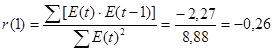 - независимости уровней ряда остатков по d -критерию (критические значения d 1 = 1,10 и d 2 = 1,37) и по первому коэффициенту автокорреляции при критическом значении r 1 = 0,32;