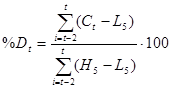 9. Для расчета %D, начиная с 7-й строки, складываем значения Ct - L 5 из графы 7 за 3 предыдущих дня, включая текущий (t=5, 6 и 7), и записываем в графе 12. Аналогично значения размаха (H 5 - L 5 ) из графы 9 складываем за 3 предшествующих дня и заносим в графу 13.