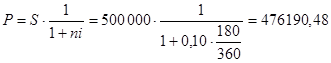 3.2. Через 180 дней после подписания договора должник уплатит 500 000 руб. Кредит выдан под 10% годовых (проценты обыкновенные). Какова первоначальная сумма и дисконт?