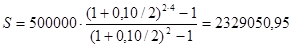 3.10. В течение 4 лет на расчетный счет в конце каждого года поступает по 500 000 руб., на которые 2 раза в год начисляются проценты по сложной годовой ставке 10%. Определить сумму на расчетном счете к концу указанного срока.