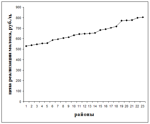 Проанализируем полученные данные. Как видно из графика, существуют явные различия между предприятиями по цене реализации молока, руб./ц., что, прежде всего можно объяснить тем, что направления производства данных предприятий часто различаются, соответственно, уровень производства и реализации также различен, также данный факт можно обосновать различием рынков сбыта продукции и удалённостью от центра. Размах колебаний составляет от первого до последнего района 273 руб./ц. Возрастание этого соотношения от района к району, происходит скачкообразно от 1 до 2 на 7 руб/ц., от 3 до 13 на 104 руб/ц., от 14 до 17 на 49 руб/ц., от 18 до 23 на 87 руб/ц.