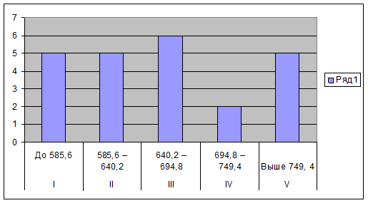 Как видно из таблицы 1.2 и рисунка 1.2, распределение предприятий по группам не равномерно. Преобладают хозяйства с ценой реализацией молока руб./ц., лежащие в интервале I,II,III и V. т.е. в интервалах до 585,6;от 585,5 до 694,8 и 749,4 и выше руб./ц. В группы с более низкой ценой реализации молока входит меньше хозяйств.