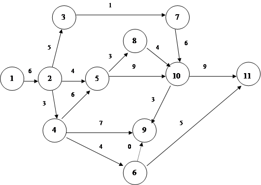 На рис. 1 графически представлена сетевая модель, состоящая из 11 событий и 16 работ, продолжительность выполнения которых указана над работами.