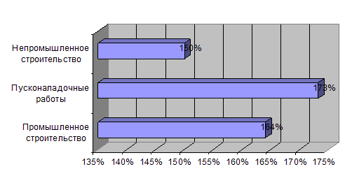 Ввод производственных мощностей на предприятии вырос по всем объектам в 2001 году по сравнению с 2000 годом. По некоторым их объектов этот рост составил от 200% до 300%. Также увеличилась доля работ, выполняемых собственными силами. Если в 2000 году она была 71%, то в 2001 – уже 76%. Доля промышленного строительства в общем объеме работ составила 69% и темп роста данного сектора строительной деятельности предприятия вырос на 50%.