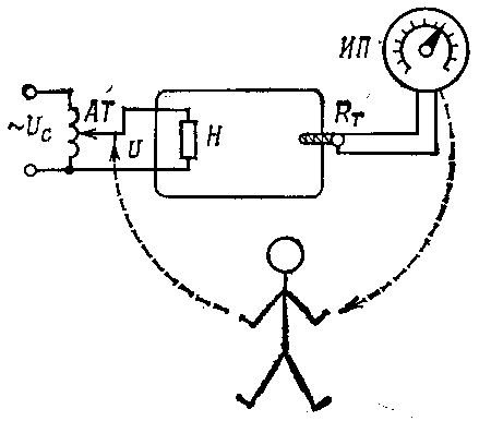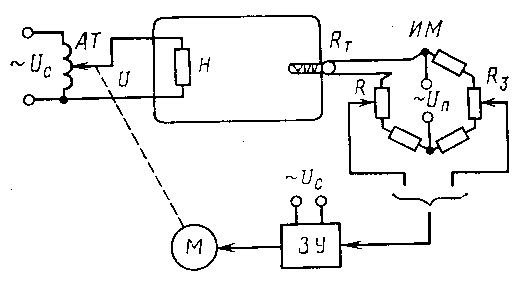 На рис. 3 показан переход от ручного регулирования температуры сушительного шкафа (рис.1) к автоматического её регулированию. Температура в сушительном шкафу (рис.3) измеряется термометром сопротивления R т, включённым в одном из плеч измерительного моста ИМ. При заданном значении температуры измерительный мост уравновешен, на вход электронного усилителя ЭУ напряжение не подаётся. При отклонении температуры от заданного значения соответственно изменяется сопротивление R т, что вызывает разбаланс измерительного моста ИМ. На электронный усилитель подаётся напряжение разбаланса, и электродвигатель М начинает вращаться, перемещая движок автотрансформатора АТ в сторону ликвидации отклонения температуры шкафа от заданного значения. При достижении заданного значения температуры измерительный мост ИМ балансируется, электродвигатель М останавливается и система приходит в равновесное состояние.