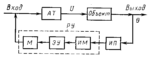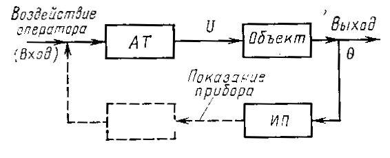 На рис.2 видно, что выход системы ручного регулирования по воздействию связан с её входом через оператора (пунктир рис.1 и 2).Из этого следует общая идея перехода от ручного к автоматического регулированию – подать регулирующее воздействие с выхода системы на её вход через определённое техническое устройство, без человека-оператора Ч-О.