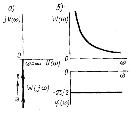 в) АЧХ представляет собой гиперболу, т.е. чем меньше частота входного сигнала, тем больше этот сигнал усиливается звеном. При w = 0 коэффициент усиления равен бесконечности, и, наоборот, при w = ¥ коэффициент усиления звена равен нулю (рис.6б).