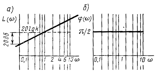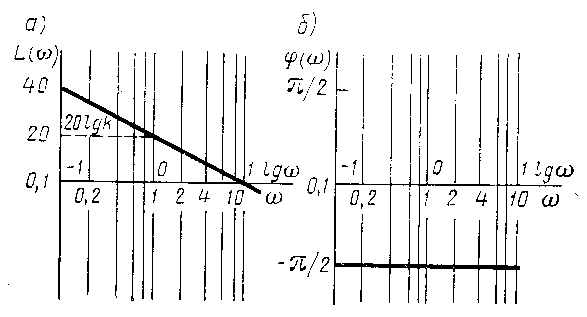 Таким образом, ЛАЧХ представляет собой прямую линию, пересекающую при k = 0 ось абсцисс в точке w = 1 и имеющую наклон к оси абсцисс 20 дБ / дек. При k¹ 1 ЛАЧХ перемещается параллельно оси ординат на величину 20 l gk (рис.7а)