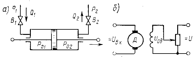 Сила давления на поршень равна p = ( p 01 - p 02 ) F , где F - эффективная площадь поршня. Если пренебречь трением и инерцией поршня. То можно считать, что это усилие целиком расходуется преодоление внешней нагрузки, приложенной к поршню (сопротивление перемещению регулирующего органа, заслонки, шибера и т.п.):