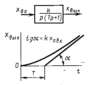 Коэффициент k называют коэффициентом усиления (коэффициентом передачи) звена по скорости. Он численно равен скорости изменения выходной величины при единичном значении входной величины. Преобразовав дифференциальное уравнение звена по Лапласу, получим px ВЫХ ( p ) = kx ВХ ( p ) , откуда находим передаточную функцию звена:
