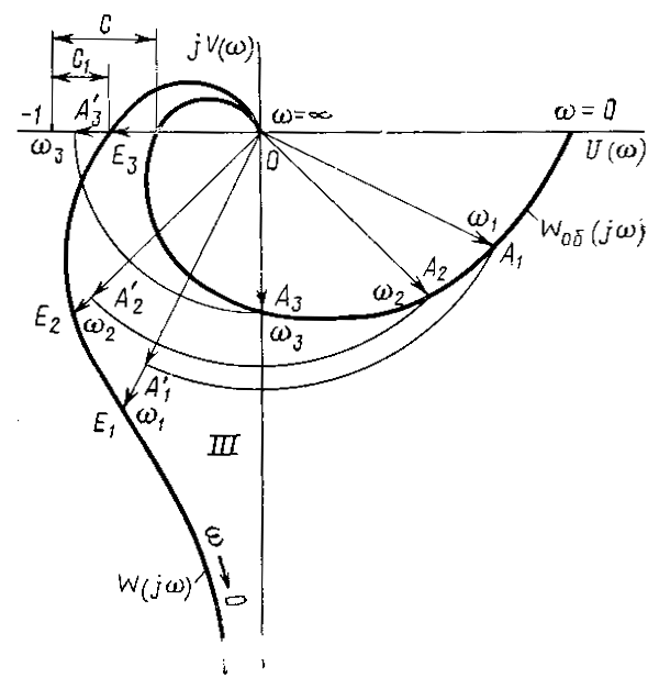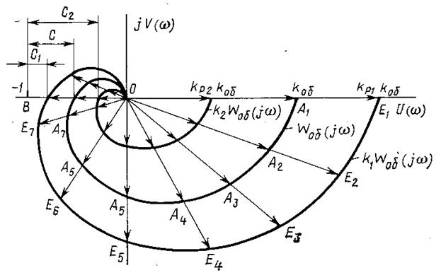 Приближение точки пересечения КЧХ разомкнутой системы отрицательной полуоси к точке В (-1, j 0) определяет запас устойчивости по модулю с замкнутой автоматической системы регулирования. При приближении КЧХ к точке В увеличивается колебательность в замкнутой системе; при пересечении этой точки (запас устойчивости с = 0) в замкнутой системе возникают незатухающие колебания, а при охвате КЧХ точки В (-1, j 0) замкнутая система неустойчива. Так как модуль КЧХ системы определяется коэффициентом передачи (усиления) разомкнутой системы на данной частоте, то степень приближения КЧХ разомкнутой системы можно регулировать путём изменения её коэффициента передачи k .