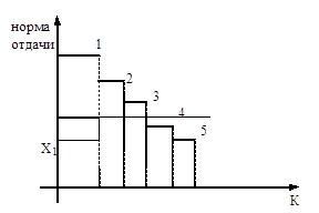 1-5 - пять видов деятельности. На этот график накладывается линия капитала. Х1 - стоимость собственного капитала, т.е. в 4-м и 5-м проектах мы не получим той отдачи, в которую нам обходится цена капитала, следовательно, они не выгодны.