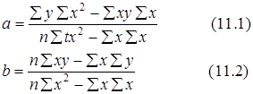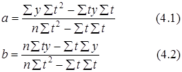 Параметр b является коэффициентом регрессии, определяющим направление развития. По методу наименьших квадратов находим a и b