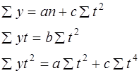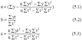 По итоговым данным таблицы определяем по формуле (5.1) - а ,по формуле (5.2) - b ,по формуле (5.3) - с .