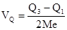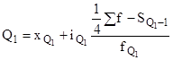 Следовательно, кроме медианы, в ряду распределения имеются три квартиля и девять децилей. Медиана одновременно является вторым квартилем и пятым децилем. Расчет первого (Q1 ) и третьего (Q3 ) квартилей аналогичен расчету медианы, только вместо медианного интервала берется для первого квартиля интервал, в котором находится варианта, отсекающая ¼ численности частот, а для третьего квартиля - ¾ численности частот: