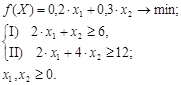 Решение. Данная задача оптимизации является задачей линейного программирования. Обозначим виды кормов через х 1 и х 2 . Целевой функцией задачи является общая стоимость кормов, затраченных на кормление животных, которая должна быть наименьшей. Число ограничений задачи равно числу питательных веществ, входящих в состав кормов - 2. Дополнительно вводится условие неотрицательности переменных. Зная цены кормов, содержание питательных веществ в них можно сформулировать математическую модель задачи линейного программирования: