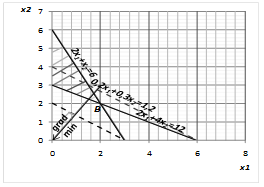 Решение данной задачи линейного программирования на максимум лишено экономического смысла, так как затраты на корм стремятся уменьшить. Однако математически эта задача имеет решение и на максимум: наибольшее значение в области допустимых решений целевая функция принимает в точке (0; 6), и это значение равно