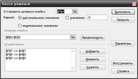 Задачу оптимизации решаем с помощью надстройки «Поиск решения » табличного процессора EXCEL (меню «Сервис »):