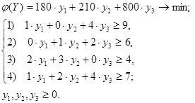 2. Обозначим двойственные оценки ресурсов I , II , III как y 1 , y 2 , y 3 соответственно. Целевой функцией двойственной задачи является общая стоимость запасов ресурсов в двойственных оценках, которая должна быть наименьшей. Число ограничений двойственной задачи равно числу переменных исходной задачи - 4. Математическая модель двойственной задачи имеет вид:
