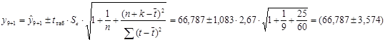 С вероятностью 70 % значение спроса на кредитные ресурсы будет находиться в интервале от 63,213 до 70,361 млн. руб.
