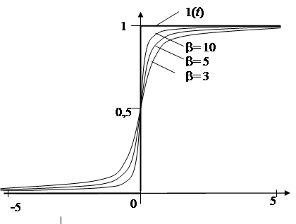 Единичная ступенчатая функция 1(t). С описательной точки зрения это функция, которая равна нулю в отрицательные моменты времени и единице - в положительные. Принципиальным недостатком таких функций является то, что они не дифференцируемы, тогда как основной математической моделью теории автоматического управления является дифференциальное уравнение.