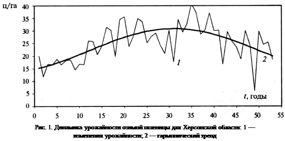 Рассмотрим динамику средней урожайности озимой пшеницы за период 1955-2007 гг. на примере Херсонской области. Ход урожайности, показанный на рис.1, присущ всем областям Украины. Первый подпериод наблюдений (1955-1990 гг.) характеризуется ростом урожайности, связанным с развитием технологий при стабильной экономико-политической ситуации. Второй подпериод (1991-2007 г) характеризуется некоторым спадом урожайности, что объясняется усилением диспаритета цен на технику, горюче-смазочные материалы, удобрения и средства защиты растений, с одной стороны, и ценами на зерно - с другой. Логичной и самой простой представляется такая конструкция тренда: восходящий линейный участок - на первом интервале и нисходящий линейный участок - на втором. Однако линейный рост (убывание) урожайности невозможен в течение длительного времени, как по физическим, так и по экономическим причинам. С математической точки зрения удобно иметь такую трендовую функцию, которая могла бы представить рост урожайности на одних временных интервалах, спад - на других, быть непрерывной и дифференцируемой. Таким требованиям отвечает гармоническая функция